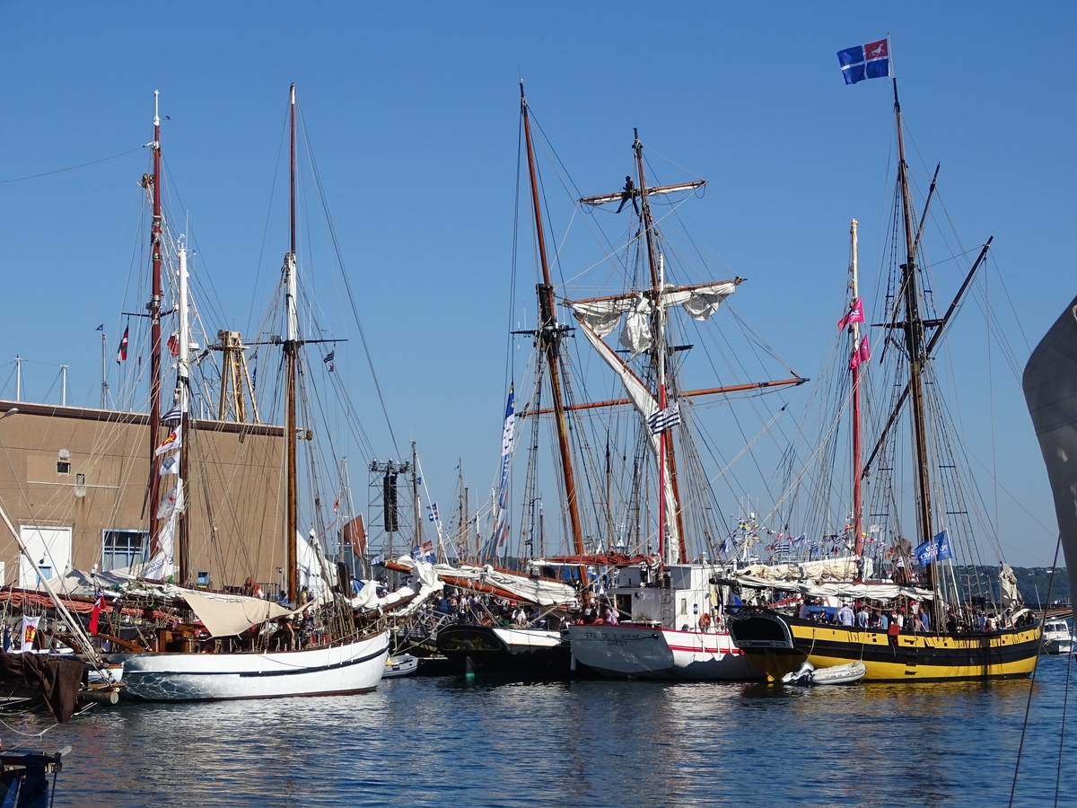 de droite à gauche : Le Renard (France) cotre à hunier de 30 m (1991), Fée de l'Aulne (France) gabare-sablière de 35 m (1958) Classé MH (2002), La Recouvrance (France) aviso-goélette de 41 m (1991) et Lola of Skagen (Angleterre) cotre aurique de 22,3 m (1919)